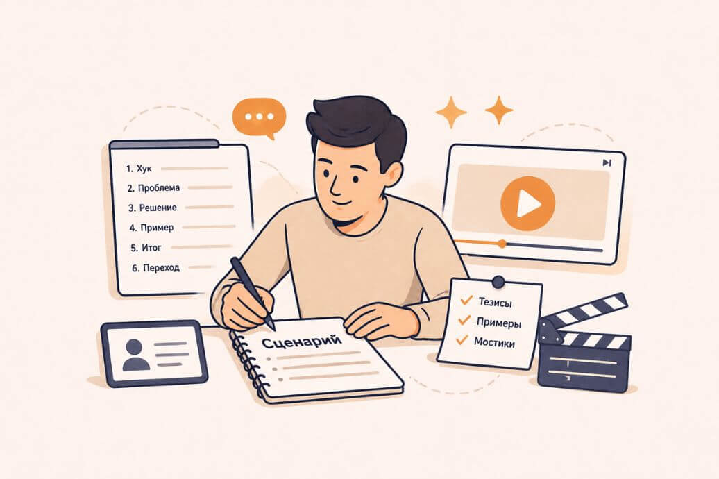 Для экспертных видео лучше использовать сценарный план, а не писать текст дословно. Достаточно структуры из тезисов, вопросов и примеров — это делает подачу живой и упрощает съёмку.