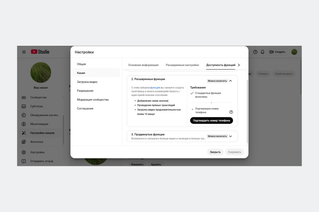 Здесь же подключите продвинутые функции. Нужно выслать удостоверение личности, либо проще выполнить проверку в виде движения лицом и головой. Еще можно подождать, начав регулярно публиковать ролики, и через несколько недель эти функции подключатся автоматически. Но в это время будете без них.